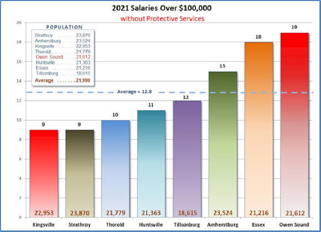 As shown above the average number of managers, in municipalities in the comparative group, on the Ontario Sunshine List is 12.8. Amherstburg, Essex and Owen Sound all have more that the average number of employees earning more than $100,000 with Owen Sound having the greatest number at 19. This seems to confirm that when it comes to managerial salary expense, Owen Sound leads the pack, at least in this group of municipalities.