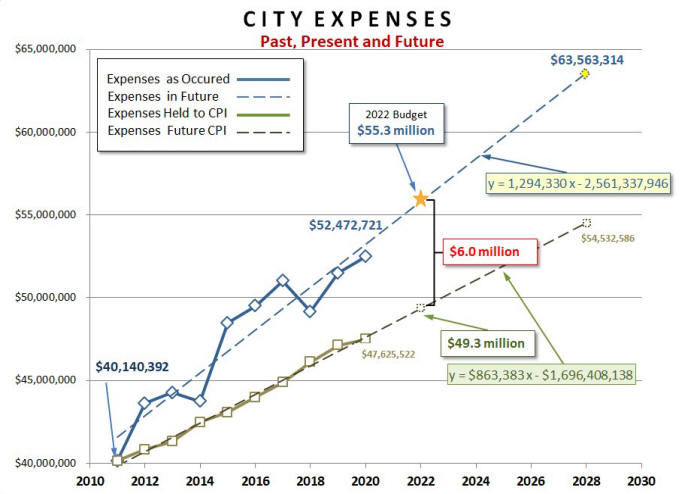 It is unreasonable to expect expenses to have been frozen at the 2006 level just because our population didn't grow.  As we all know, the cost of products and services go up a little every year.  It would have been reasonable for city expenses to grow at the same rate as inflation.  Had the annual increases in expenses been capped at inflation, the total expenses in 2021 would have been $48.5 million instead of the $54.5 million that actually occurred. That puts the excessive growth in expenses to be in the order of  $6.0 million for the period 2006 to 2021.  Approximately, 76% of this would have affected the total tax levy which also includes a portion going to the County. That 's a difference of about $4.5 million in the tax levy. A generous approximation is that $350,000 represents a one percent increase in the tax levy. So had the city held the annual increase in expenses to inflation over the past 11 years, the tax levy would be approximately 13% or $4.2 million less than the $32.5 million that it is today.