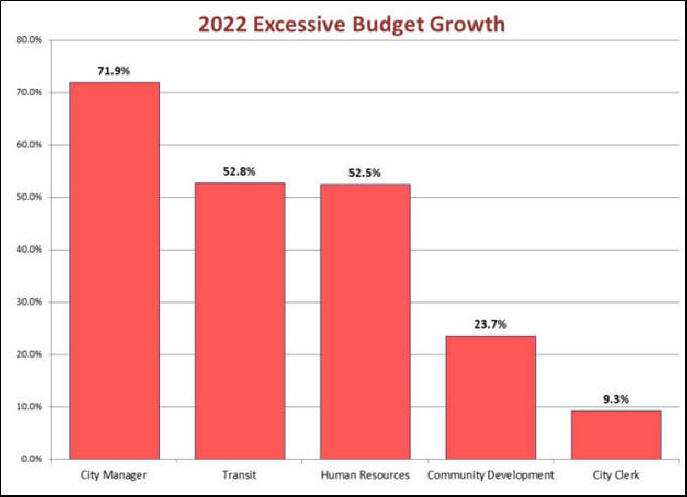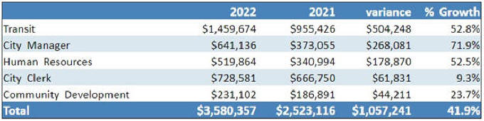 After reviewing the excessive growth that occurred in the Art Gallery I thought I should take a quick look at the growth of other departments as reported in the 2022 Budget. In the 2022 budget, there were 5 areas that had extreme budget growth in excess of 9%. The City Manager 's Office experienced the greatest growth on a percentage basis of 71.9%. This was followed closely by Transit which grew by 52.8%. Human Resources grew by 52.5%. Community Development grew by 23.7% and the Clerk 's office grew by 9.3%. As for the 71.9% increase in the City Manager 's Office – it seems excessive and given the times we are in Council should not have been approved this increase