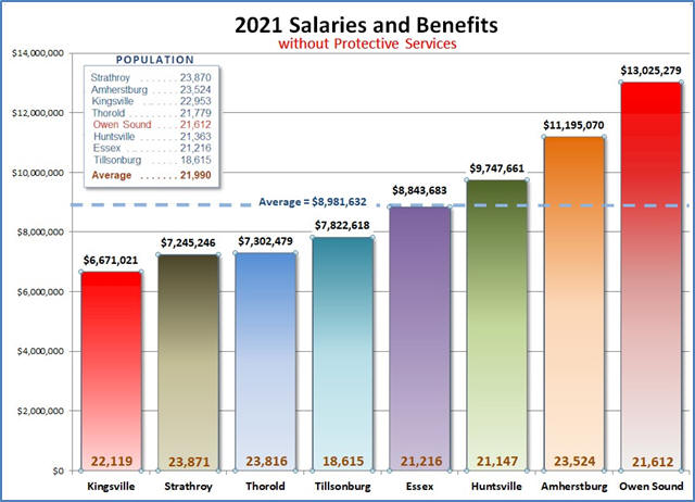 As you can see there are four municipalities with greater populations than Owen Sound and three with lower populations. The average salary expense for these municipalities, excluding protective services salaries, was just about $9 million. Huntsville, Amherstburg and Owen Sound all have a Salary Expense greater than the average.