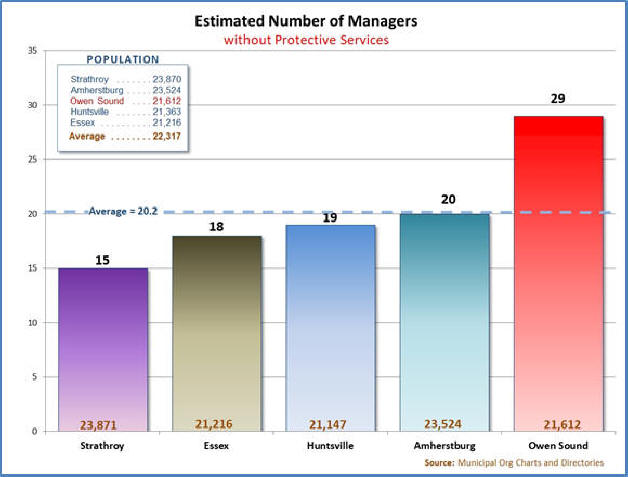Owen Sound 's workforce has grown well beyond that employed by other, similarly sized, municipalities and has been excessively high for many years. The workforce in general is much larger than needed. However, the management team is, at a minimum, carrying 8-9 managers more than needed in comparison with other similarly sized municipalities.